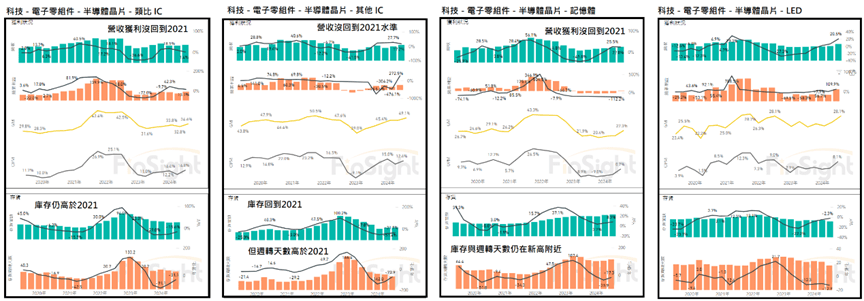 - 和2021年相比很多回不去:雖然許多細領域庫存有去化,但若看到絕對金額與週轉天數,多數其實是比2021水準還高,而營收與獲利能力卻回不到2021年的水準。(消費型商品雖然已經沒有庫存超高基期壓力,但需求只要沒有回溫,庫存水準就還是沒有偏低,大概只有DriverIC除外,這個庫存已經降到很低了)