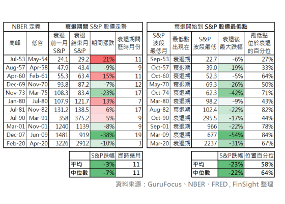 假設認為今年經濟衰退出現是較確定的事件,則參考過去,股價波段低點將 100% 發生在衰退期間,且從衰退開始起算仍有平均 20% 下跌空間。